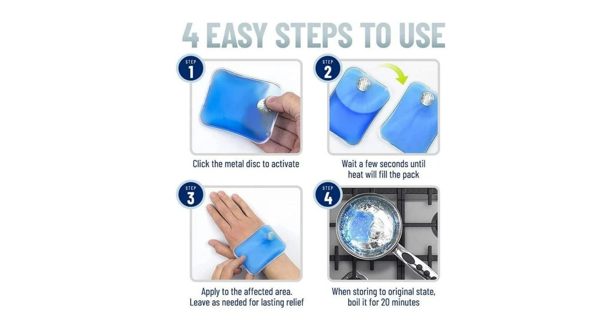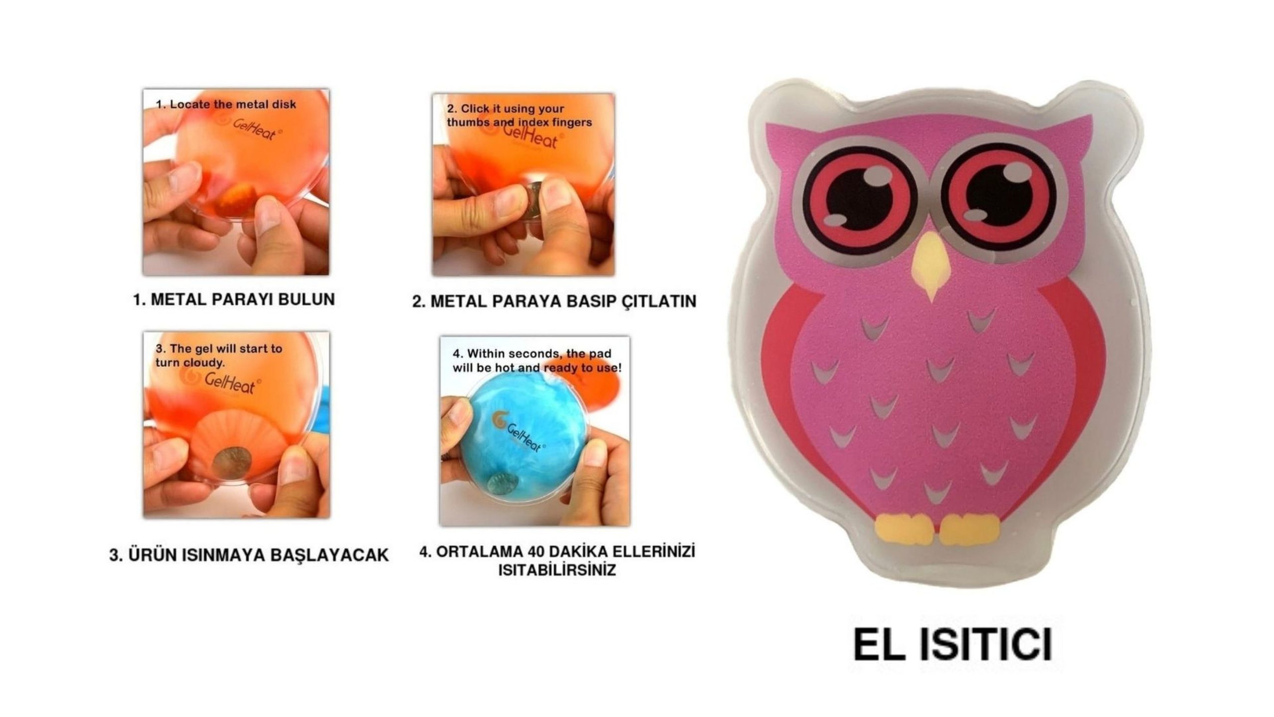 Kullanım Şekli:Paketin içindeki meta parayı elinizle çıtlatın. Metal çip katalizör görevi görmektedir, sonrasında jel katılaşacaktır. Sıcaklığı 30-40 dk sonunda yavaş yavaş azalacaktır.Tamamen soğutulduğunda, tüm kristaller jel halini alana kadar (5-10 dk) kaynar suda ısıtınız. Herhangi bir kesilme veya yırtılma olmadığı, çip kırılmadığı sürece ısıtıcıyı tekrar tekrar kullanabilirsiniz.Nasıl Çalışıyor? Jelin içindeki metali çıtlatıyorsunuz. Metal çipimiz Katalizör görevi görmekte. Tepkime sonucunda Sıvı Sodyum Asetat tuzu, katı hale geçiyor ve bu faz değiştirme esnasında dışarıya ısı veriyor, bu ısı 50 Dereceye kadar çıkıyor ve 30-45 dk süresince tepkime devam ediyor. Daha sonra, katı halde soğumuş i Isıtıcıyı, kaynatarak, tekrar Jel haline geçmesini ve potansiyel bir ısı kaynağı olmasını sağlıyoruz.